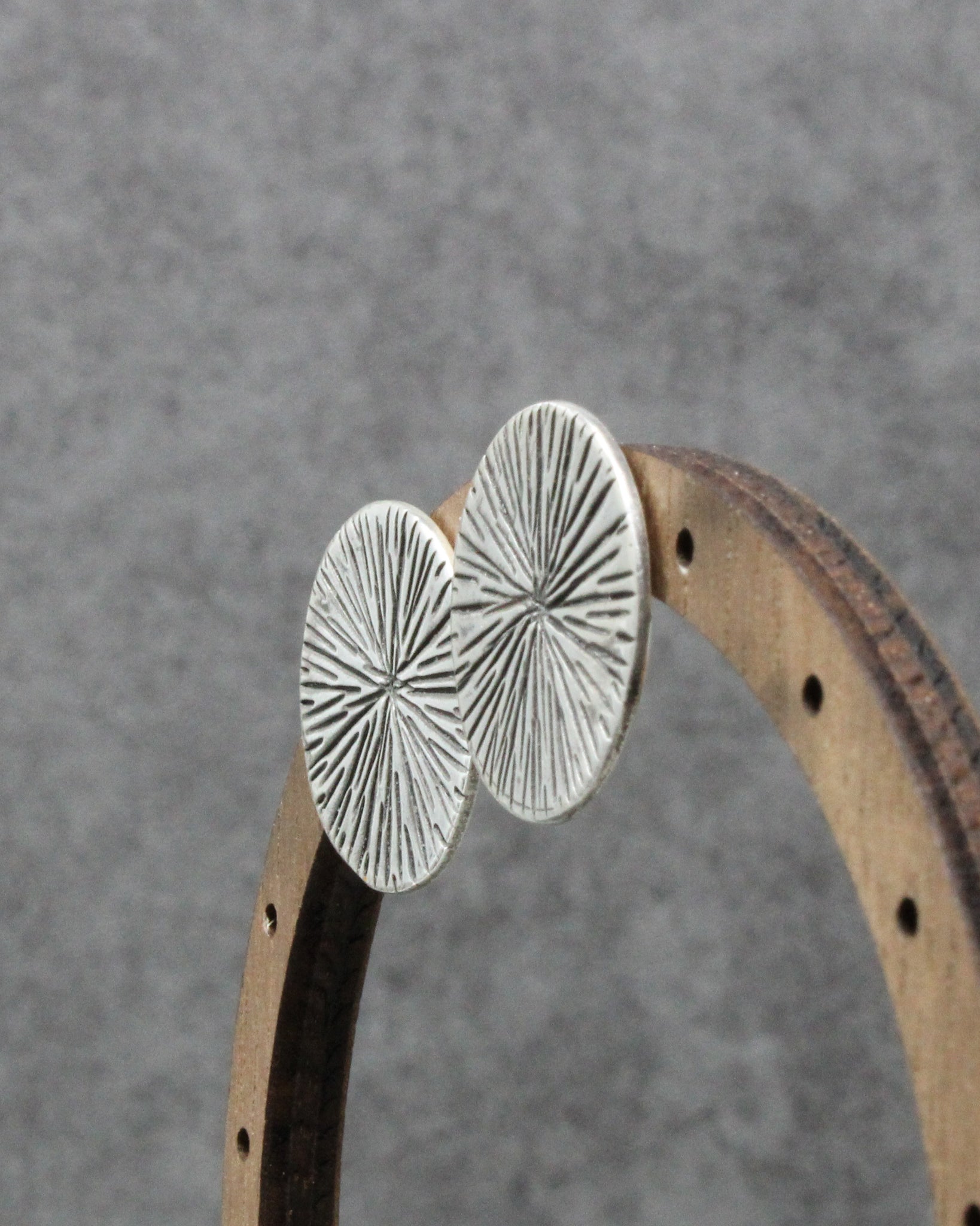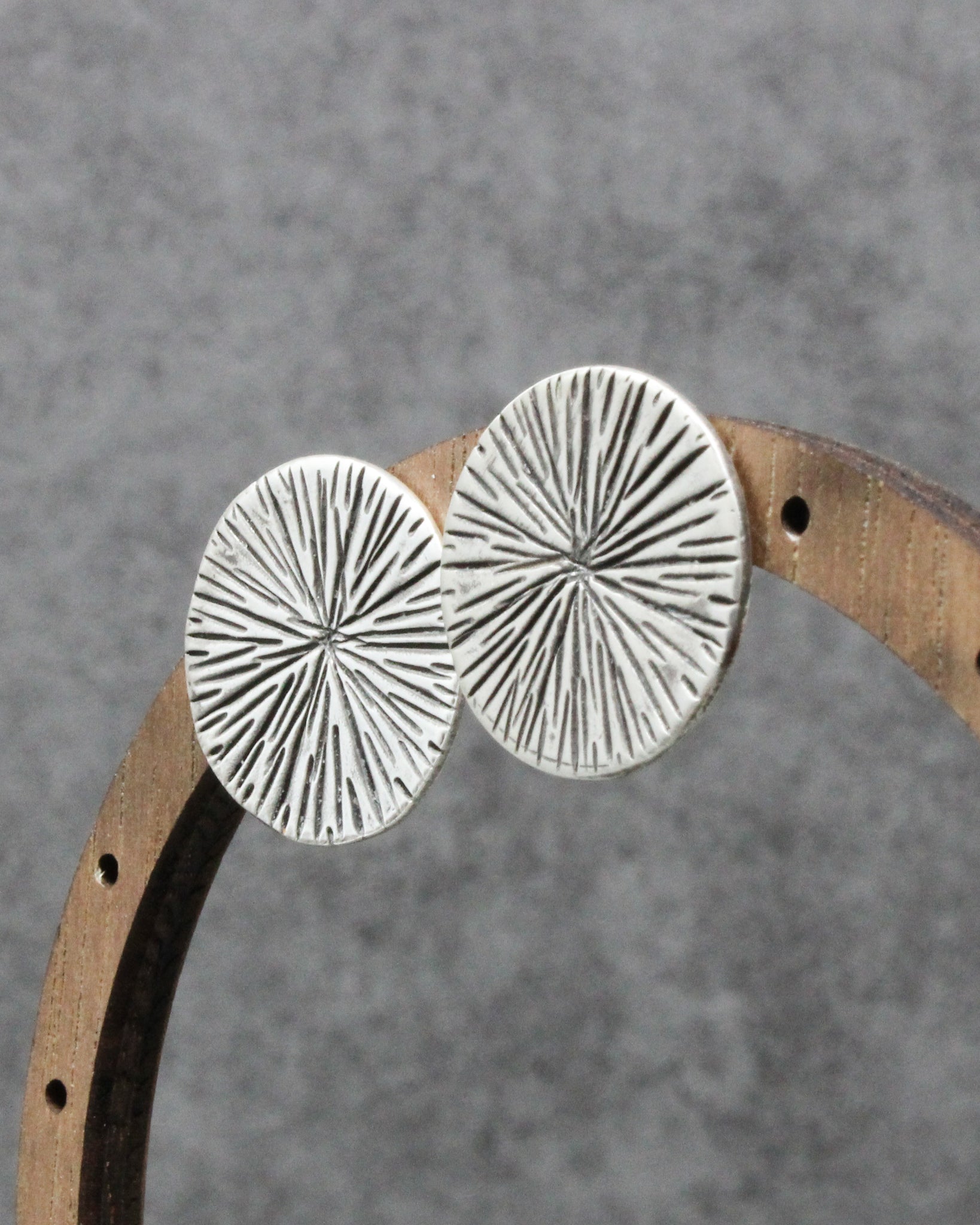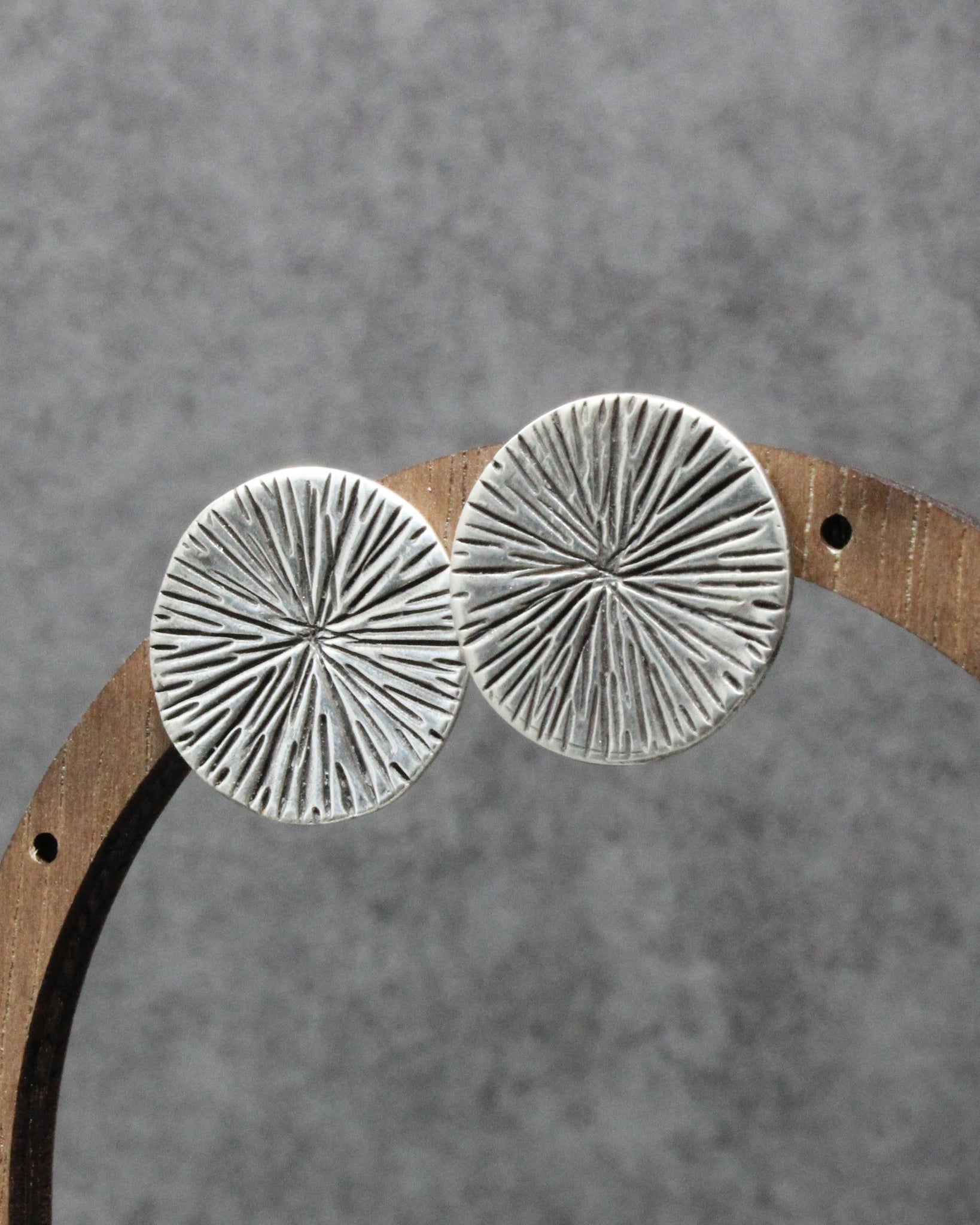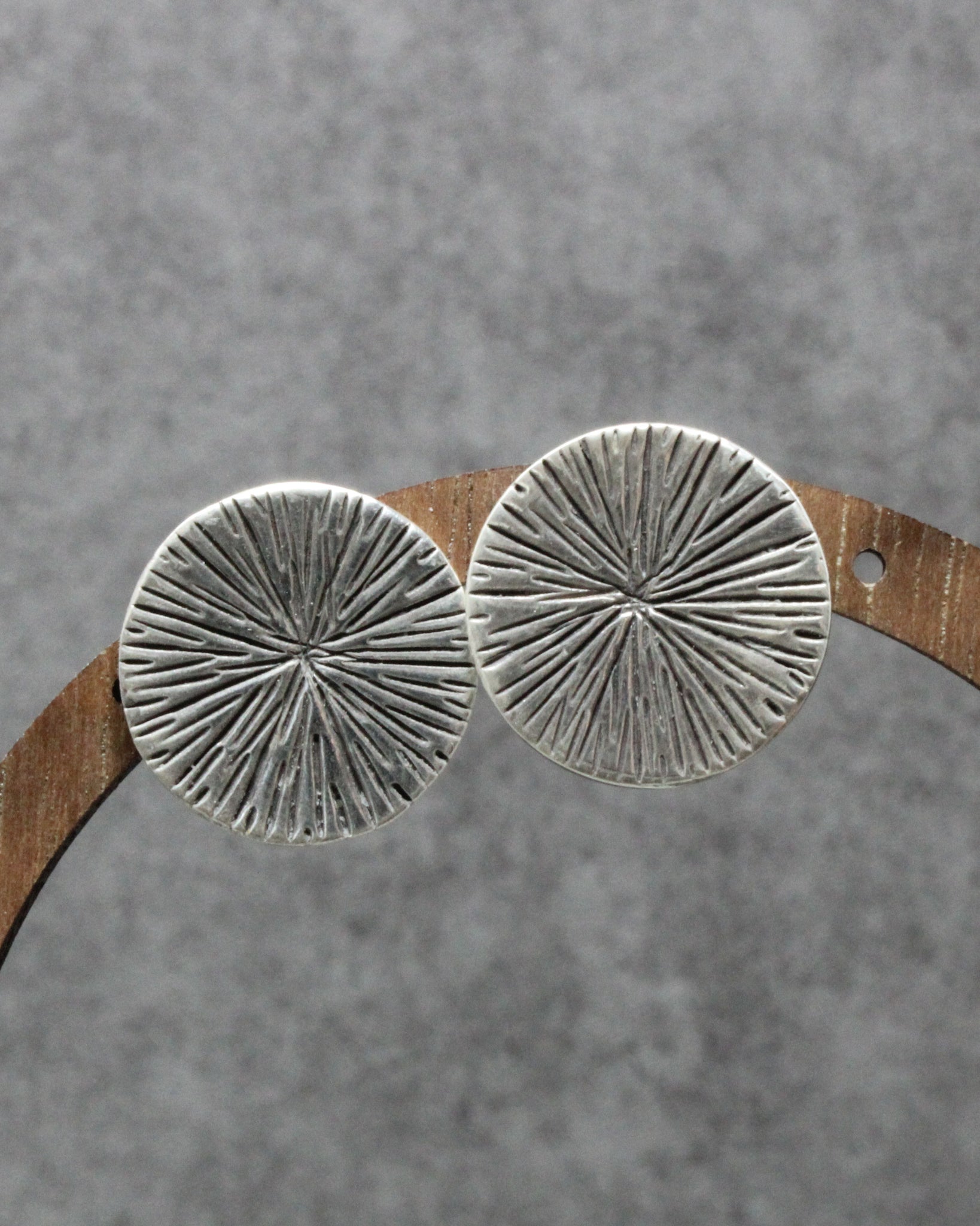 Each earring is a perfect circle that has been line stamped many times to achieve a bursting effect. The earrings have stud ear wire with two rubber backings per earring and have an approximate diameter of 0.75 in.