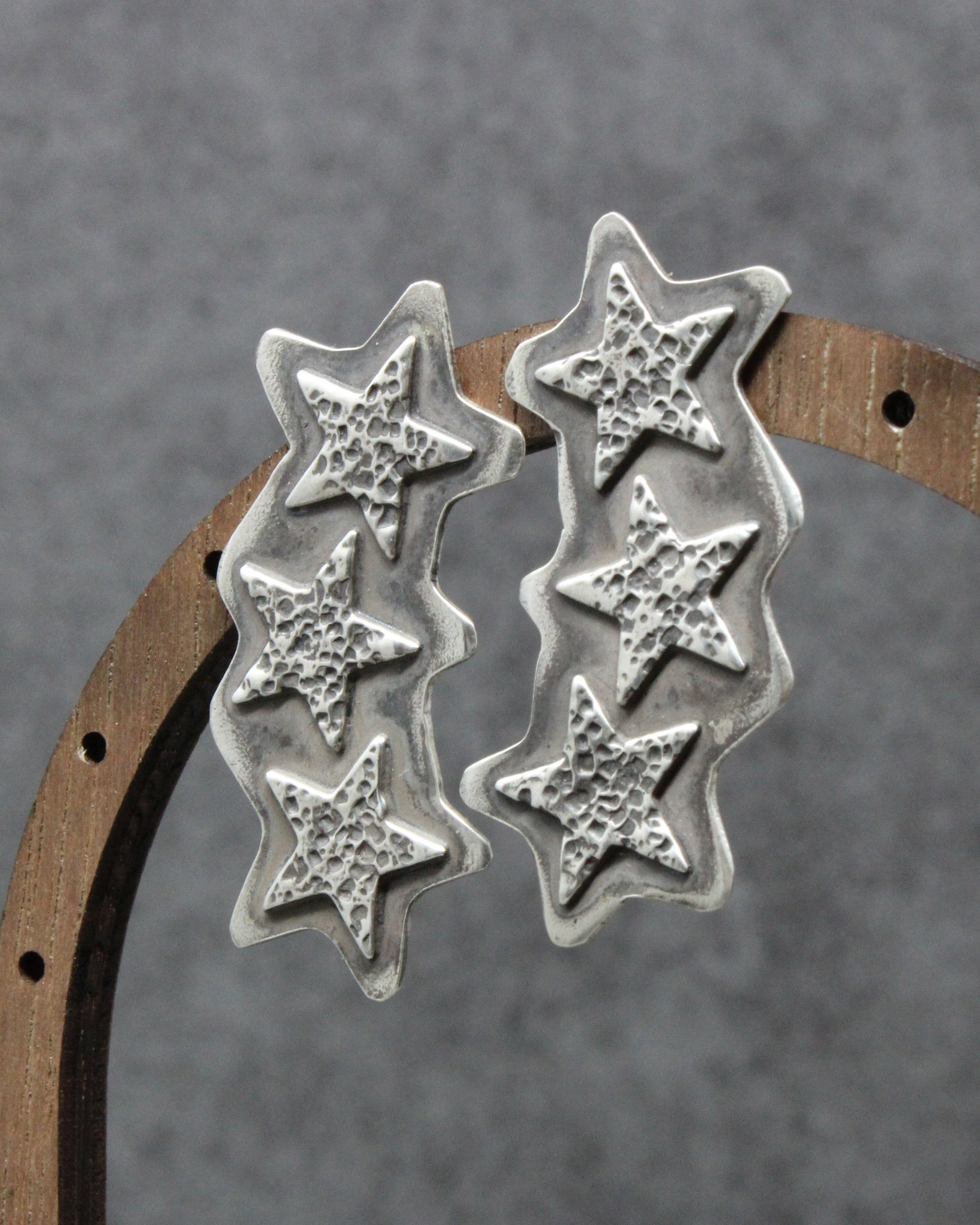 Each star on the earrings was cut out individually, textured and soldered onto a base plate. The darker silver against the light colored stars makes a beautiful contrast and visual texture to the pair. Each earring comes with two rubber backings and measures at approximately 1.5 in tall by 0.75 in wide.