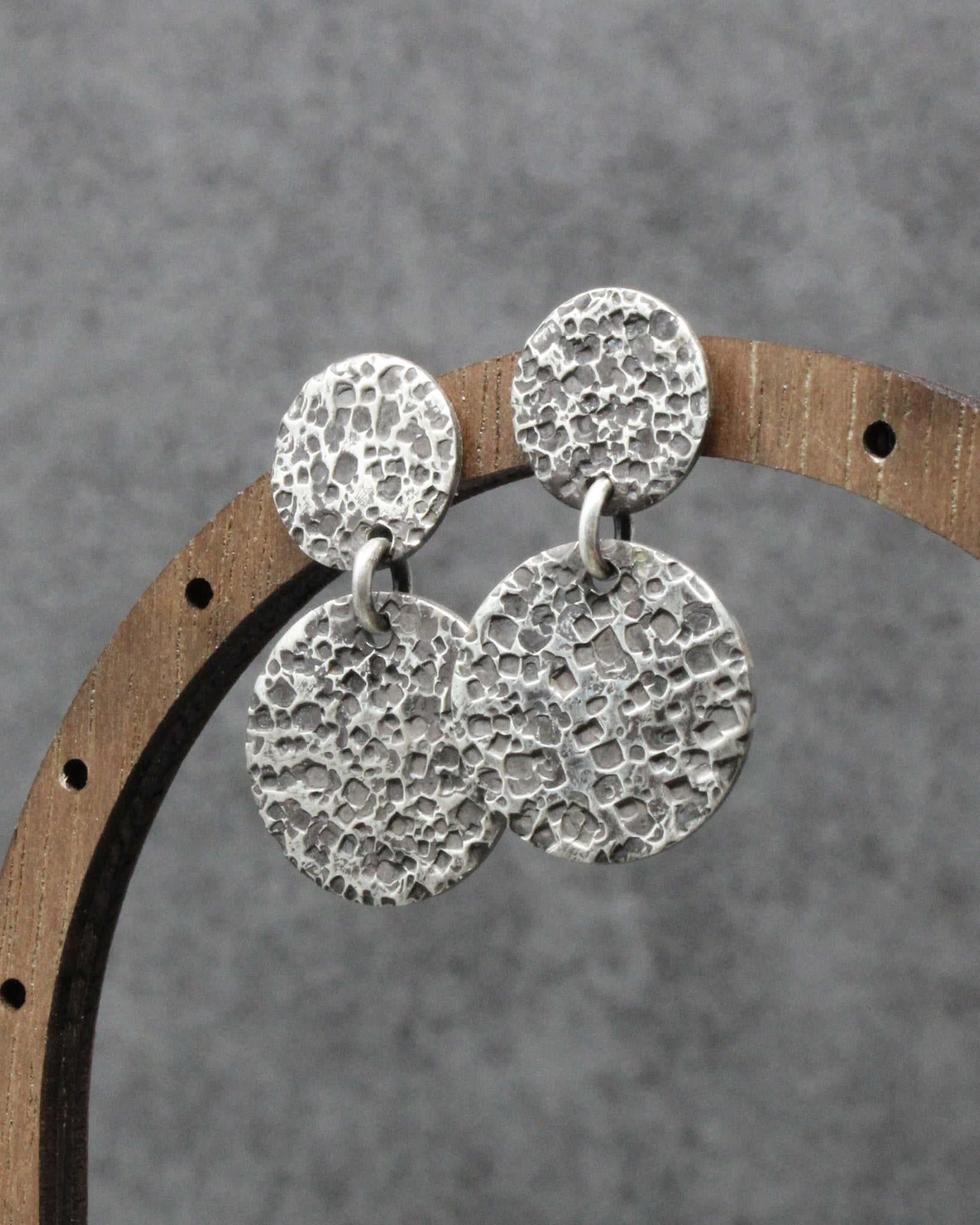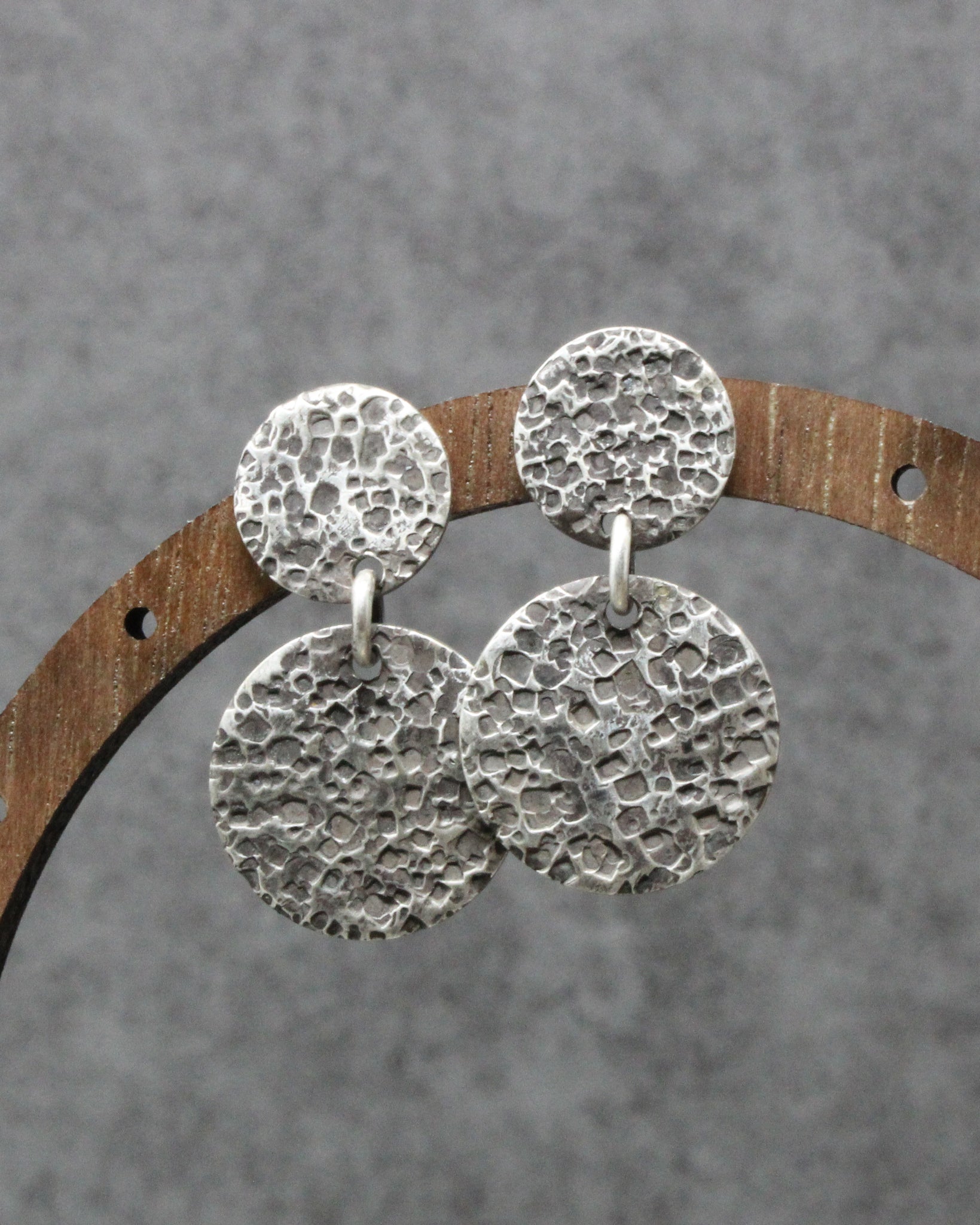 These earrings use stud ear wire. They come with two rubber backings for each earring. Each earring is forged with two textured circles and approximately measures to be 1.2 in tall and 0.6 in wide.